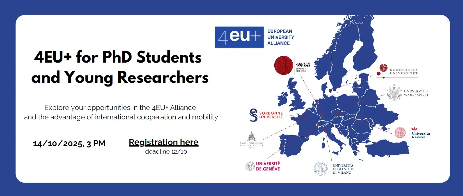 The 4EU+ Working Group Mobility cordially invites doctoral candidates, young researchers, and PhD programme coordinators to participate in an online infosession on 14 October 2025, 3:00–4:30 PM.
