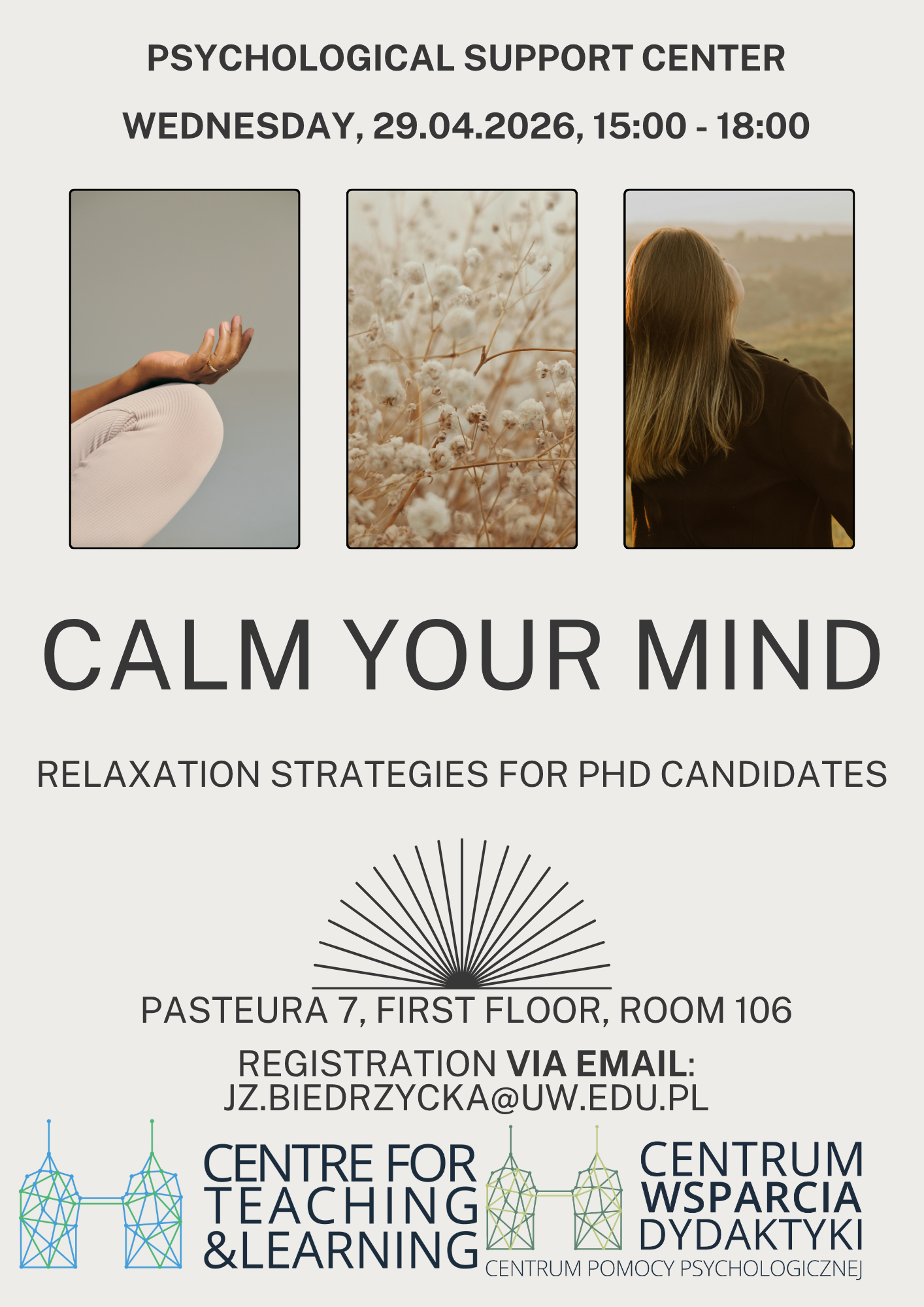 How to sign up? At Psychological Counseling Center at Pasteura 7 or by e-mail: jz.biedrzycka@uw.edu.
