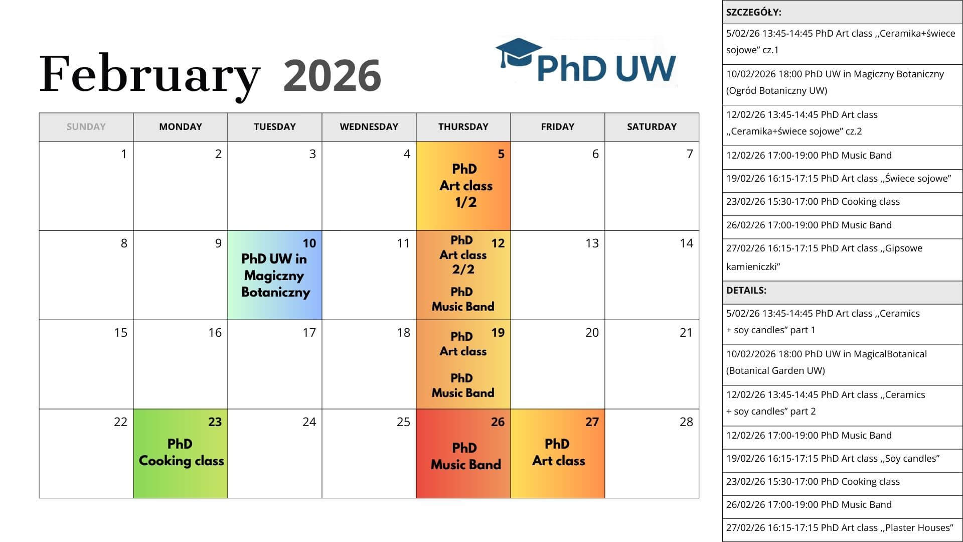 PhD UW powstało z myślą o integracji oraz budowaniu silnej, zaangażowanej społeczności Doktorantek i Doktorantów Uniwersytetu. W grudniu i styczniu zorganizowaliśmy m.in. warsztaty kulinarne, a swoje pierwsze kroki stawia również grupa muzyczna. Na luty przygotowaliśmy kolejne propozycje, w tym wspólny spacer do Ogrodu Botanicznego oraz warsztaty artystyczne. Harmonogram znajdziecie Państwo w załączniku.