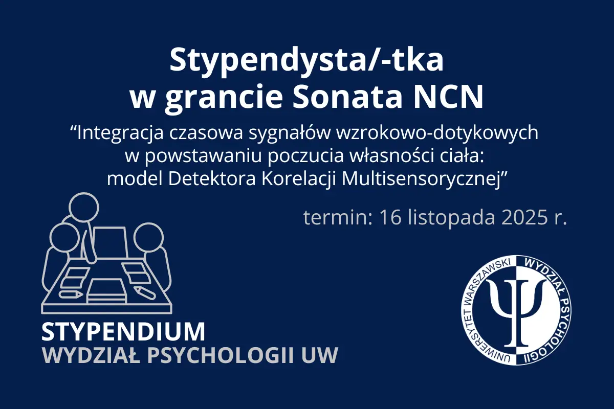 Poszukujemy stypendysty/ki w projekcie “Integracja czasowa sygnałów wzrokowo-dotykowych w powstawaniu poczucia własności ciała: model Detektora Korelacji Multisensorycznej”, kierowanym na Wydziale Psychologii UW przez dra Piotra Litwina. Celem projektu jest wyjaśnienie i opisanie, przy pomocy modelu obliczeniowego, procesu powstawania poczucia własności ciała jako efektu dynamicznej integracji sygnałów wzrokowo-dotykowych. Projekt jest finansowany przez Narodowe Centrum Nauki w ramach projektu SONATA 20 (2024/55/D/HS6/00965).