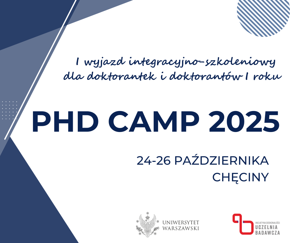 Mamy ogromną przyjemność zaprosić Państwa na I wyjazd integracyjno-szkoleniowy dla doktorantek i doktorantów I roku „PhD Camp 2025”, który odbędzie się w dniach 24–26 października 2025 r. w Europejskim Centrum Edukacji Geologicznej Uniwersytetu Warszawskiego w Chęcinach.