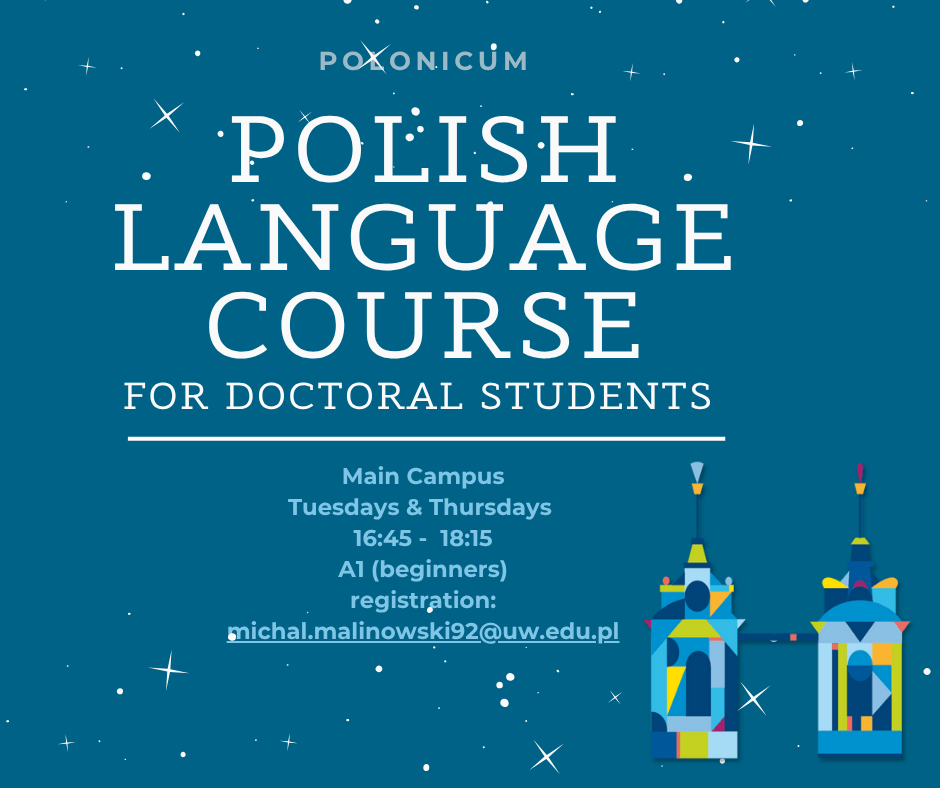 POLONICUM invites UW Doctoral Students to participate in a regular, one-semester (60 hours) Polish language course at the elementary level (A1, for complete beginners), held on Tuesdays and Thursdays from 16:45 to 18:15 at the Main Campus.