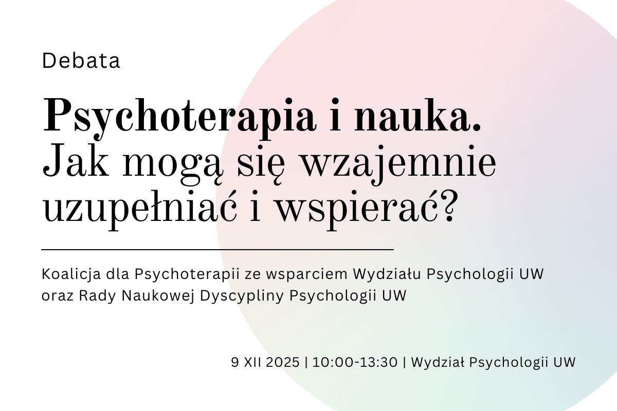 serdecznie zapraszamy na debatę pt. “Psychoterapia i nauka. Jak mogą się wzajemnie uzupełniać i wspierać?”, która odbędzie się na Wydziale Psychologii we wtorek 9 grudnia. Debata będzie gościć znakomitych prelegentów i dyskutantów. Nadarza się świetna okazja, aby porozmawiać o psychoterapii i roli nauki w jej rozwoju.